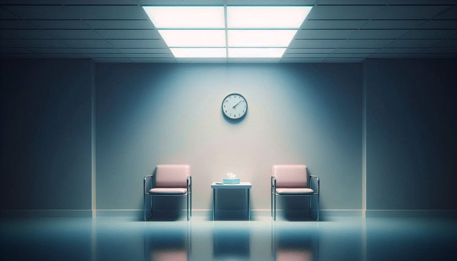 The same waiting room as before. The same clock still hangs on the wall. June is alone.